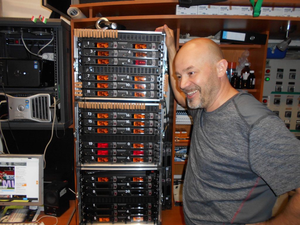 A felújítás után kaptunk 24, akkor új Sennheiser mikroportot, ez a 3000-es széria volt, gyakorlatilag egy analóg, hagyományos mikroport, azokból az egyik csúcskategória, SK50-es adókkal, amelyek profin működnek a mai napig is. Már a hőskorban is Sennheisert használtunk, mert az bizonyult leginkább megbízhatónak, és ezt egyáltalán nem azért mondom, mert tudom, hol jelenik majd meg az interjú.