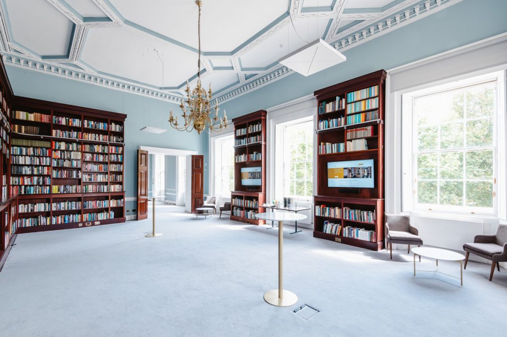 A földszinten helyezkedik el a szintén elegáns belvilággal rendelkező Könyvtár is, melyet a hozzáférhetőség és az egyszerű használat biztosítása érdekében szintén hasonló AV-felszereléssel láttak el. Dempsey a következőképpen ecsetelte a műemlékvédelmi épületben végzett munka kihívásait: „Mivel a falakhoz és a mennyezethez nem nyúlhattunk, a házban dolgozó csapat a padló felülről történő megemelésével tudta biztosítani a kábelek károkozás nélkül telepítését. Szakértelmük felbecsülhetetlen értéket jelentett az épület épségének megőrzésében.”