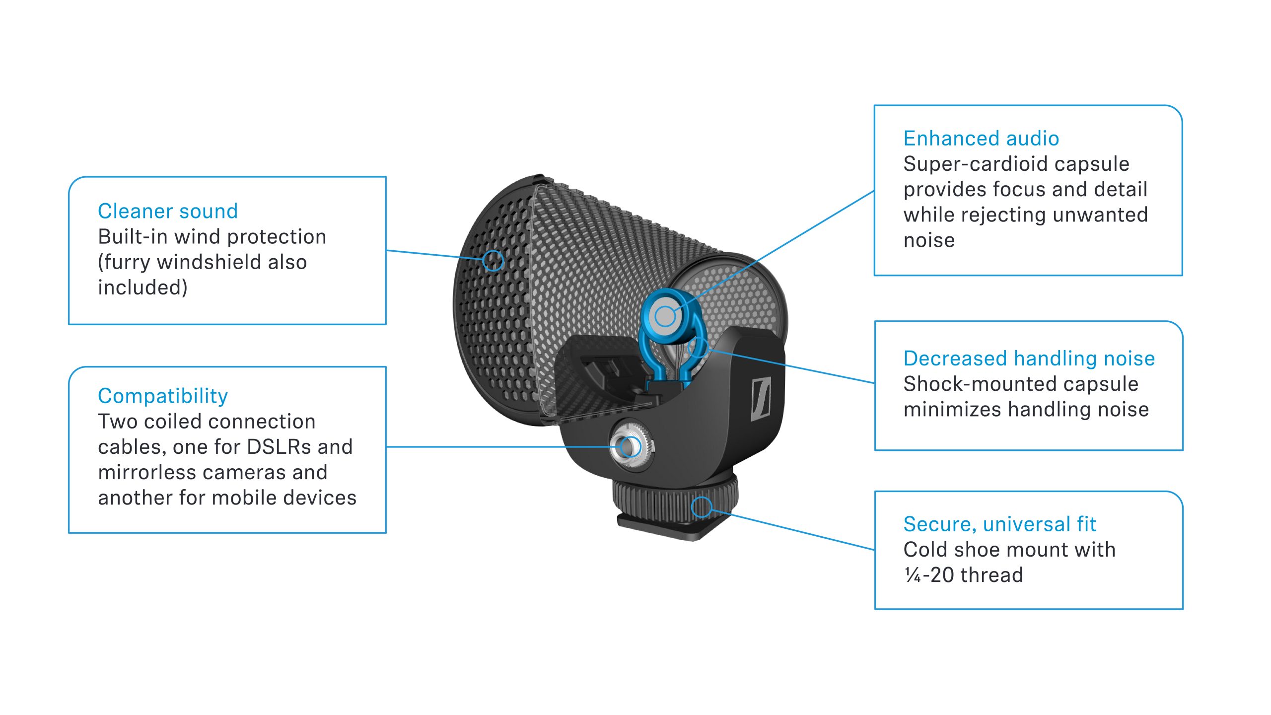 A kapszula rugalmas felfüggesztést kapott, ami azt jelenti, hogy a kamera vagy az okostelefon kezeléséből eredő zajok nem kerülnek továbbításra a mikrofon felé.