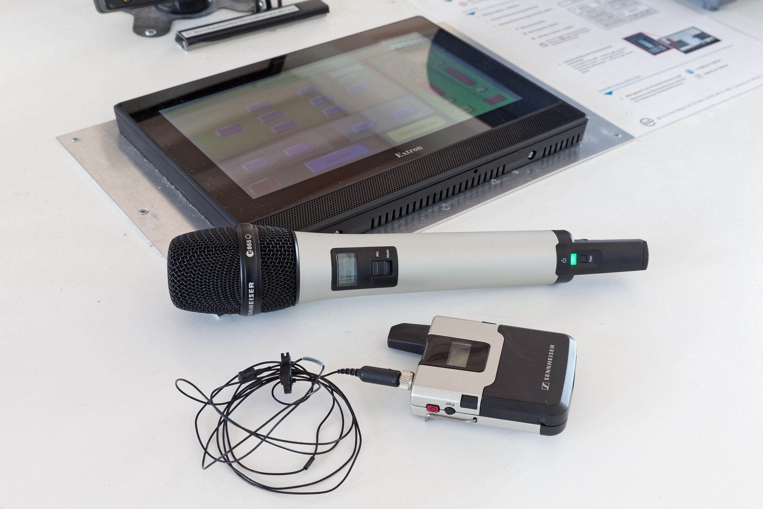 Az MLU előadótermeiben jellemzően max. három SL Rack Receiver DW egységet használnak. Ezekhez vezeték nélküli asztali mikrofonok (SL Tablestand 133-S DW) és kézimikrofonok vagy zsebadók társulnak. Az SL Handheld DW kézimikrofonok MME 865-1 szuper-kardioid kondenzátor kapszulával vannak szerelve, míg az SL Bodypack DW zsebadókhoz csíptetős vagy fejmikrofonok tartoznak. A lavalier mikrofonokat (gömbkarakterisztikájú Sennheiser MKE 1) a Weinberg Campus előadó- és szemináriumi termeiben tartják, míg az SL Headmic 1 fejmikrofonokat (gömbkarakterisztikájú) és a hozzájuk tartozó zsebadókat főként higiénés megfontolásból az egyes szemeszterek időtartamára az oktatók személyes rendelkezésére bocsátják, akik az eszközöket irodáikban tárolják. Az MLU többi helyszínén az adóegységeket egy központi helyről adják ki.