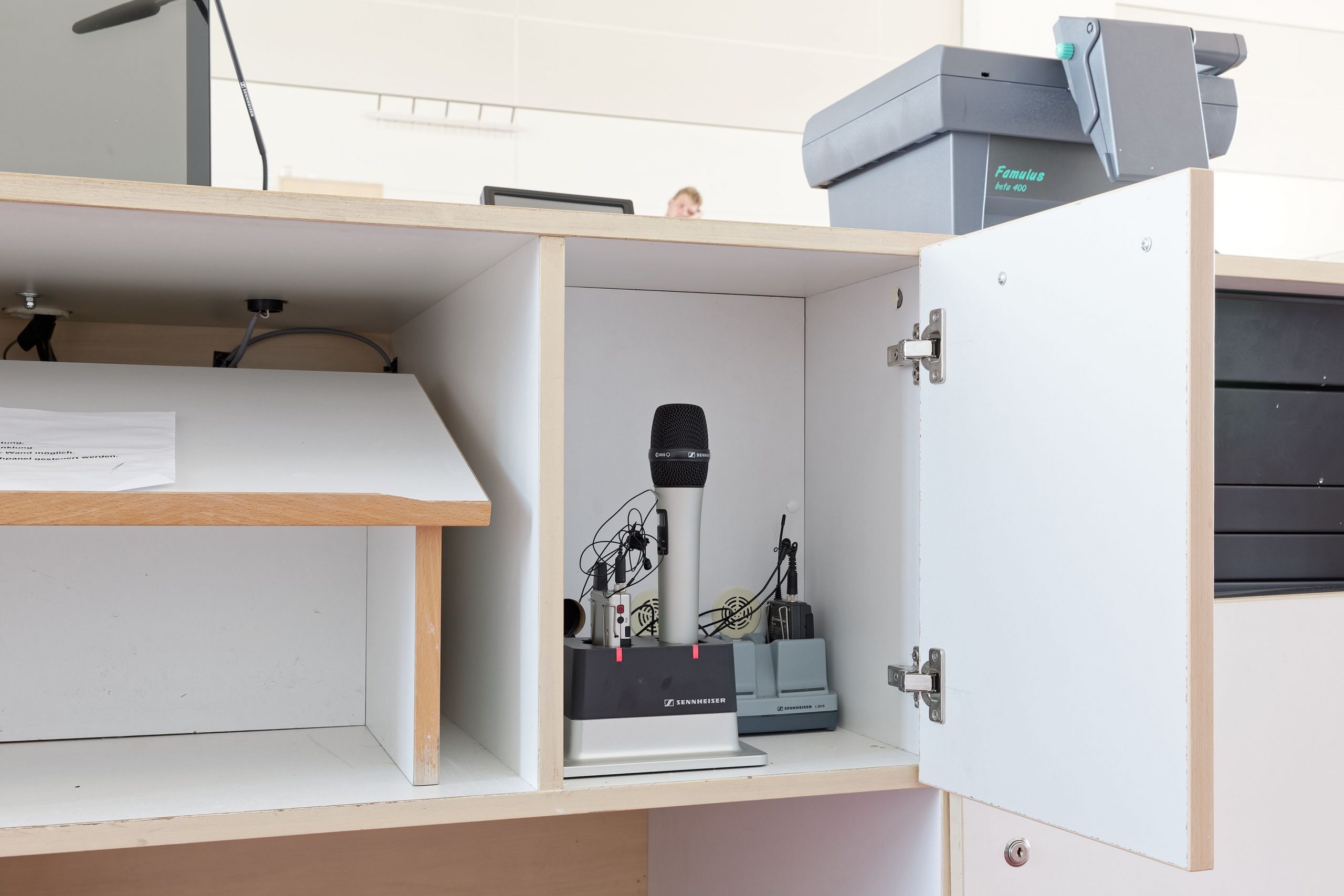 A Sennheiser töltőeszközeit (kétnyílásos CHG 2 töltőegységek) az oktatók zárható íróasztalaiban tárolják. „A SpeechLine DW eszközök teljesen feltöltött akkuval hihetetlenül hosszú ideig képesek üzemelni” – erősítette meg Karsten Schröder. „Konferenciák alkalmával az adóegységeket kora reggeltől késő estig problémamentesen tudom használni. Az akkutöltöttség kijelzése mindig megbízhatónak bizonyult.” Használatot követően az oktatók visszahelyezik az adóegységeket a töltőkre. Ez a gyakorlatban problémamentesen működik, és a felhasználók rendszeresen gondoskodnak arról, hogy az akkumulátorok teljesen fel legyenek töltve. „A SpeechLine DW rendszereknél nem kell többé az akkuk cserélgetésével bajlódni” – mondta Karsten Schröder, a Sennheiser SLDW vezeték nélküli rendszereinek előnyeit ecsetelve.