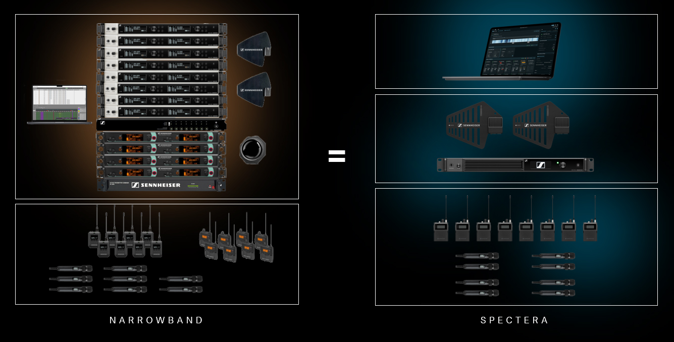 A Spectera termékcsalád többcsatornás alkalmazásokhoz készült, így egy 6 vagy 8 MHz-es blokkot foglal. Ez első hallásra úgy tűnhet, mintha a spektrum nagyrészét foglalná, különösen akkor, ha valaki a hagyományos beállítási módokhoz és képességekhez szokott. Közelebbről megvizsgálva azonban láthatjuk, hogy egy hagyományos keskenysávú technológiát használó három-/négytagú zenekar is pontosan ennyit igényel. Hiszen a fülmonitorokkal együtt 12-16 audio kapcsolatra van szükségük, így 2 csatorna/MHz-cel számolva 6-8 MHz-et kapunk.