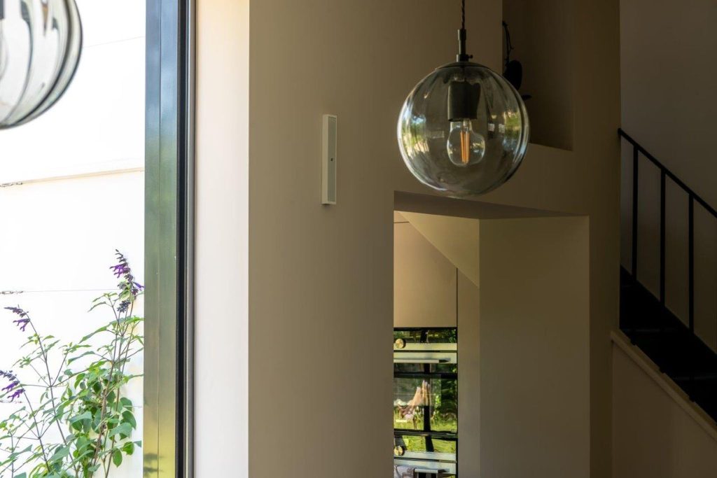 A csapat úgy gondolkodott, hogy mivel a szélessávú KV25 hangszórók kompakt méretük ellenére is erőteljes és magával ragadó hangzást biztosítanak, a 150 Hz-es tartomány alatt a mélysugárzóval kiegészülve részletgazdag hangzással képesek megtölteni a helyiséget. A hangszórókat a padlótól a mennyezetig érő, kertbe vezető üvegajtó két oldalán helyezték el, így a 140°-os vízszintes szórási szöggel a hang kényelmesen lefedi a nagyméretű konyhát – a nyitott boltíven keresztül az étkezőbe is közvetlenül átjutva –, míg a keskeny 40°-os függőleges lefedettség kivédi a mennyezetről vagy a pultról való visszaverődést, és a helyiség teljes egészében egységes hangzásról gondoskodik.