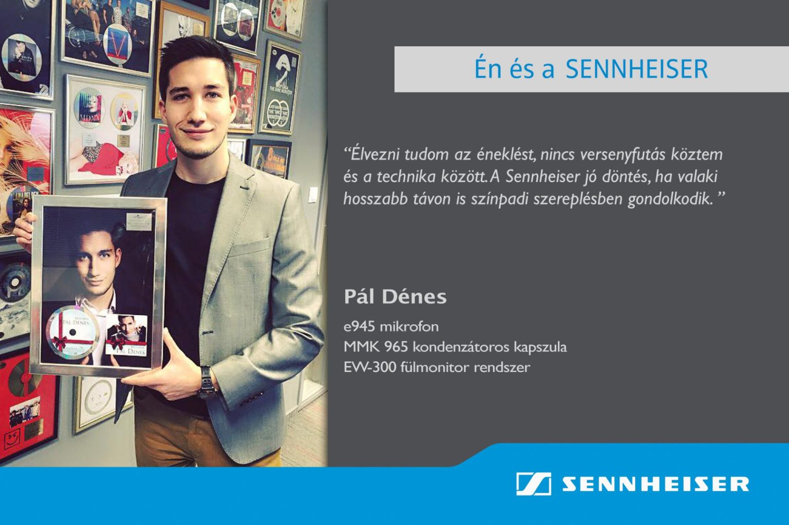 A történet a tévészereplésekkel kezdődött. A The Voice tehetségkutató folyamán találkoztam először a márkával, a műsor felvételei folyamán végig azt használtam, utána jött A Dal, majd a Sztárban sztár, ahol szintén ilyen márkájú mikrofonokkal dolgoztunk a produkciók készítése során. Fellépésekkor viszont nem, és bár nyilván nem mérhető stúdiókörülményekhez egy-egy színpadi előadás technikája, hiszen a helyíni hangosítás sok mindent meghatároz, azt mindig lehet érezni, hogy mi szól vissza a mikrofonokból, és én mennyire érzem magam komfortosan. A tapasztalatok azt mutatták, hogy a Sennheiser mikrofonjai voltak azok, amelyek a lehető legdinamikusabban, teltebben, tisztábban adták vissza a hangot. Tavaly nyár közepén hoztam meg azt a döntést, hogy állandóan ilyen mikrofont kellene használnom, akkor kezdődött a tényleges együttműködésünk. Most élvezni tudom az éneklést, nincs versenyfutás köztem és a technika között. Megszabadultam egy felesleges plusz tehertől, és sokkal inkább tudtam koncentrálni más dolgokra a színpadon A Sennheiser jó döntés, ha valaki hosszabb távon is színpadi szereplésben gondolkodik.