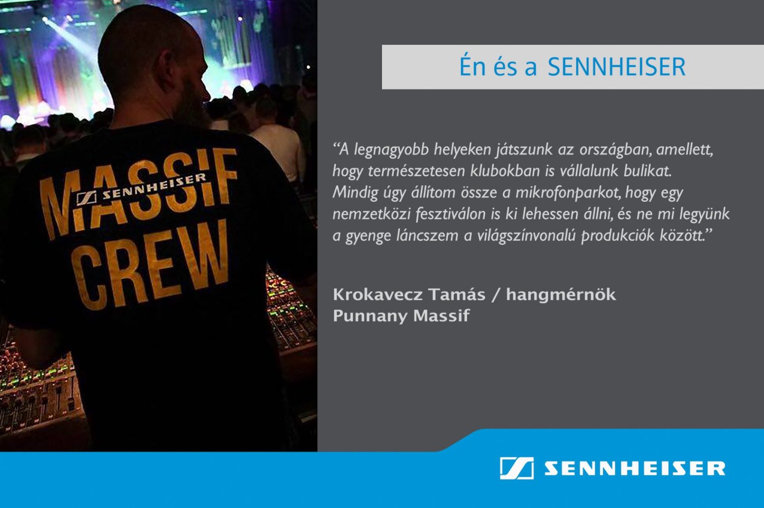Krokavecz Tamás jóideje elismert szakembernek számít a magyar zenei színtéren, ha az élő hangosítás kerül szóba. Néhány éve Magyarország egyik legsikeresebb produkciójában vesz részt, hiszen többek között ő a Punnany Massif állandó hangmérnöke is. A most következő interjúból sok egyéb mellett az is kiderül, milyen kihívásokat rejt magában egy tízfős zenekar megszólaltatása élőben. Hogyan találtátok meg egymást a Sennheiserrel?