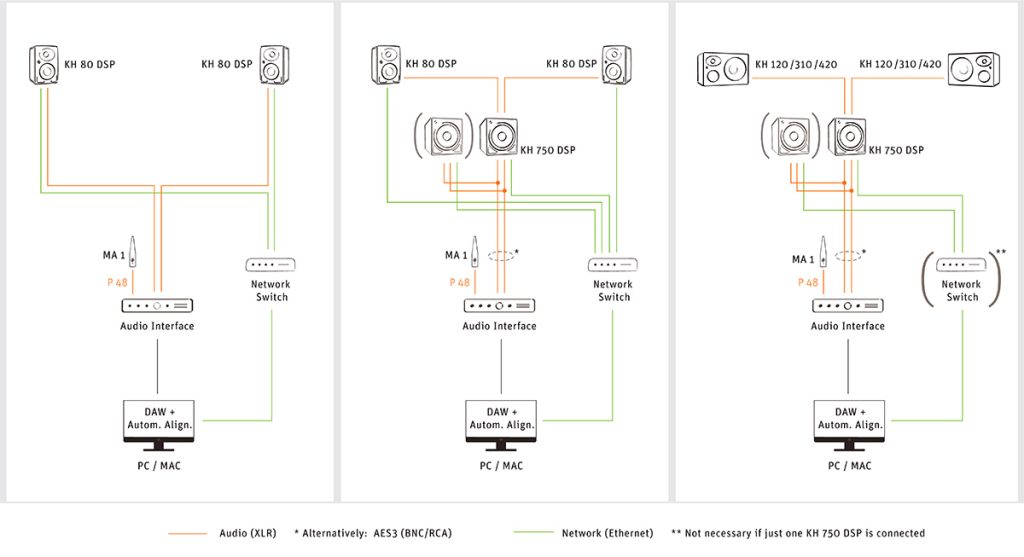 Az Automatic Monitor Alignment szoftver a KH 750 DSP mélynyomóhoz csatlakoztatott analóg KH-sorozatú monitorhangfal-párokkal is használható. A KH 750 DSP elegendő feldolgozási teljesítménnyel rendelkezik ahhoz, hogy a teljes rendszert összehangolja – a kimeneteihez csatlakoztatott két analóg hangszórót is beleértve. Ezenkívül a KH 120, KH 310 és KH 420 hangfalak a beépített sáváteresztő szűrők fázisgörbe linearizálásából is profitálnak! Az eredmény: tisztább hangzás, szárazabb basszus, valamint a visszhang és az akusztikus terek precízebb visszaadása.
