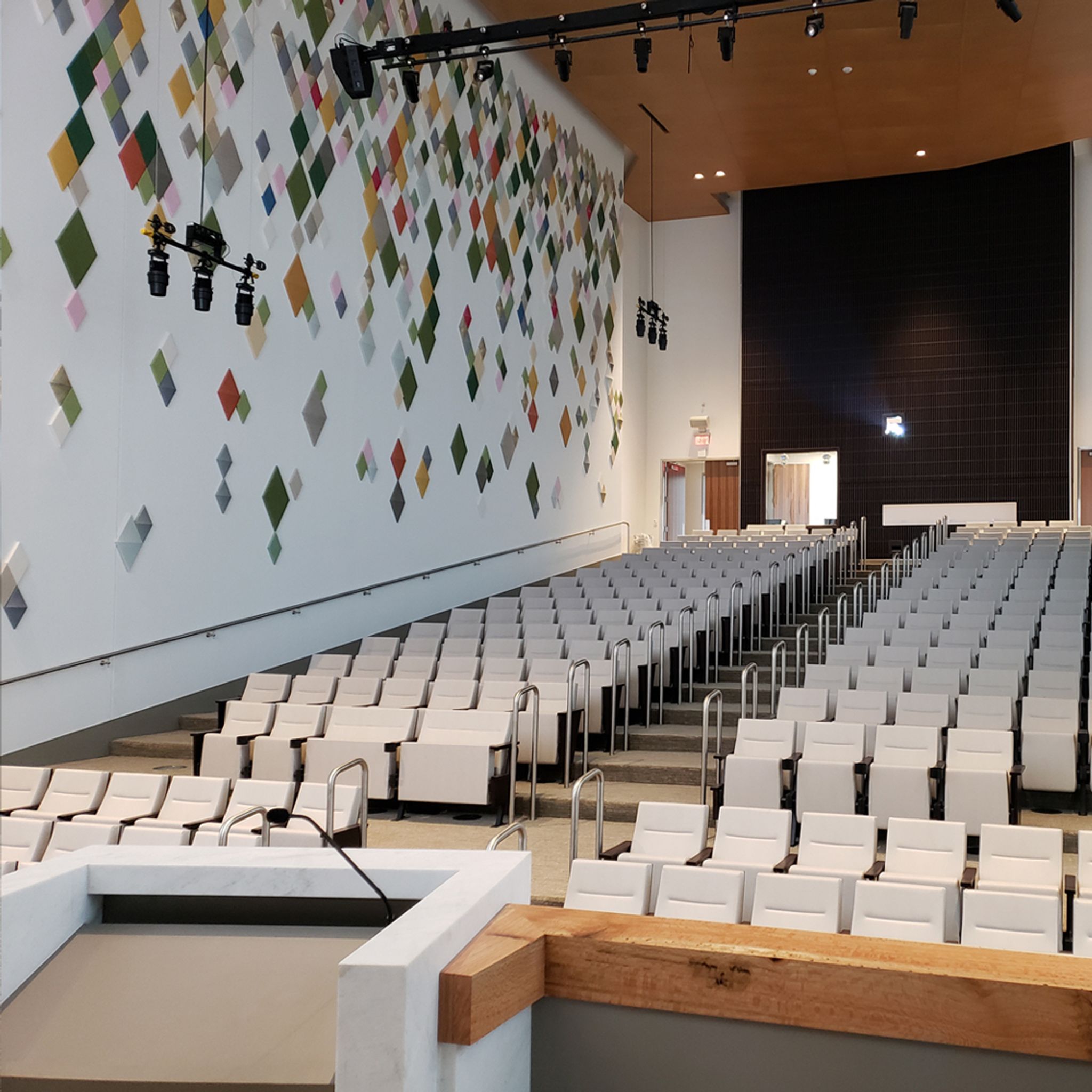 Annak érdekében, hogy a 240 hallgató mindegyike számára optimális beszédérthetőséget és azonos hallgatási élményt biztosítsanak, minden egyes ülőhelyet saját keskeny Lyzard-KZ14 hangszóróval láttak el. A konferenciaterem kialakítása pedig tovább segíti beszédhang precíz visszaadását. A mélyfrekvenciás spektrum kiemelése és a hangzás melegségének növelése érdekében tizenöt Truffle-KTR24 mélynyomót rejtettek el az előadóterem központi részén. Ezek meghajtásáról két Thunder-KMT12P erősítő gondoskodik. A 1Path technológiai partner által támogatott K-array USA egy olyan konferenciatermet tervezett és telepített, amely az előadóra nagyobb hangsúlyt fektetve és kevesebb figyelemelterelő megoldást alkalmazva javítja az általános tanulási élményt