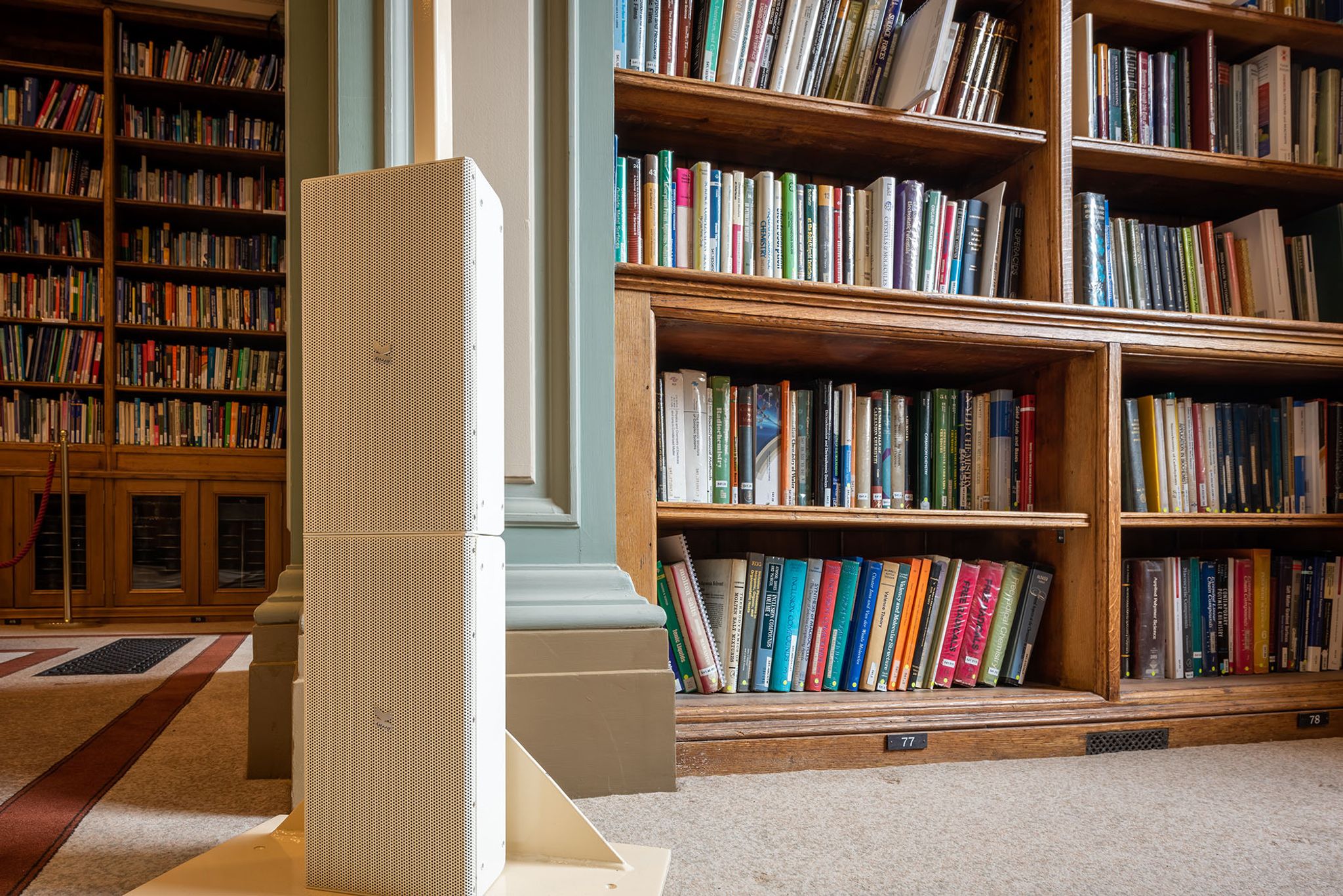 A K-array hangszórórendszert a 2B Heard igazgatója, Dave Wooster modellezte. A tervek szerint a rendszernek képesnek kellett lennie arra, hogy a terem minden pontján tisztán és teljeskörűen adja vissza a beszédet és a zenét a központi vetítővásznon és a terem két oldalán elhelyezett kiegészítő HD monitorokon megjelenő képhez kapcsolódóan. Az épület műemlékvédelmi státuszához igazodva a hangrendszert két egyedi állványokba épített Rumble-KU26 mélynyomó, valamint a terem két oldalán elhelyezett egy-egy Vyper-KV52 line-array alkotja. Ezenkívül a könyvtár fala mentén, az LCD monitorokat tartó pódiumokon is megbújik diszkréten pár fél méter magas Vyper-KV25 line-array hangsugárzó.