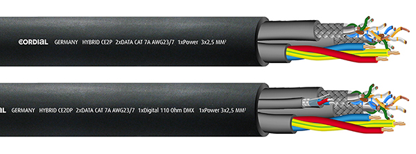Ezt szem előtt tartva, a kábelgyártó német CORDIAL által bevezetett két új hibrid kábel biztosan állni fogja az idő próbáját. A nagyteljesítményű 2,5 mm2-es tápegységgel rendelkező CORDIAL CE 2 P kábel 2 eret egyesít magában a CORDIAL CCAT 7A Long-Run távkábelből, ami tökéletes hibrid távkábelt eredményez. Ugyanez vonatkozik a CORDIAL CE 2DP modellre is, amely ezen felül még egy DMX/AES/EBU szabványoknak megfelelő 2 x 0,22 mm2-es kábelt is tartalmaz (precíz, 110 ohm-os ellenállással).