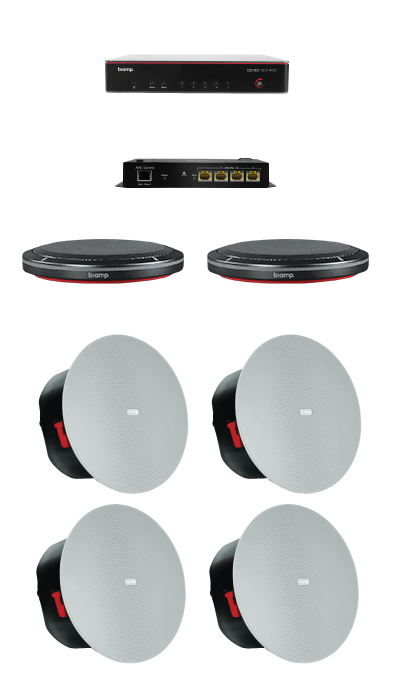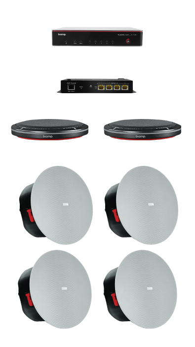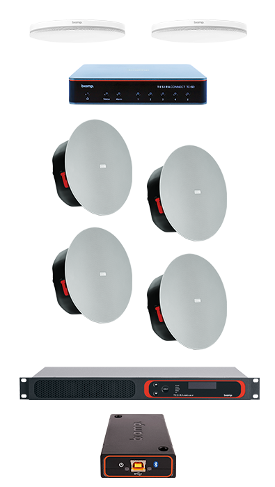 Közepes méretű tárgyalótermekhez tervezett csomag, TesiraFORTÉ X 400 DSP-vel és fehér mennyezeti mikrofonnal.