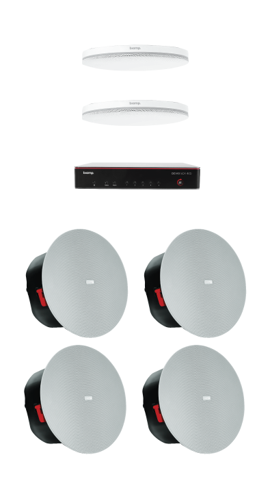 Nagyméretű tárgyalótermekhez tervezett csomag, Devio SCX 400 jelprocesszorral és fehér mennyezeti mikrofonokkal
