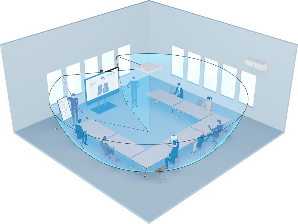 A mennyezeti mikrofon és a hangosítási rendszer kombinációja természetes és problémamentes kommunikációs élményt nyújt a beszélgetés minden tagjának, függetlenül attól, hogy ugyanabban a helyiségben tartózkodnak vagy online vesznek részt.