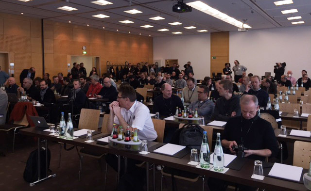 A Sennheiser Digital 6000 hivatalos bejelentésére meghívott újságírók a konferencia megkeszdése előtti pillanatokban a Hannover-i Radisson Blu hotelben
