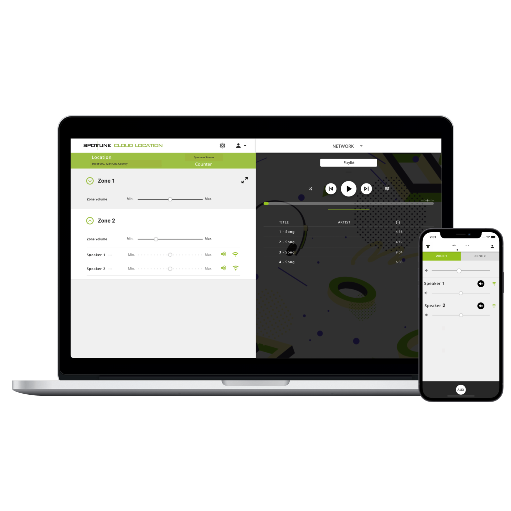 A Spottune vállalati felhő-alapú szolgáltatásán keresztül a lejátszási lista, a hangerő és a hangzás online vezérelhető és szinkronizálható.