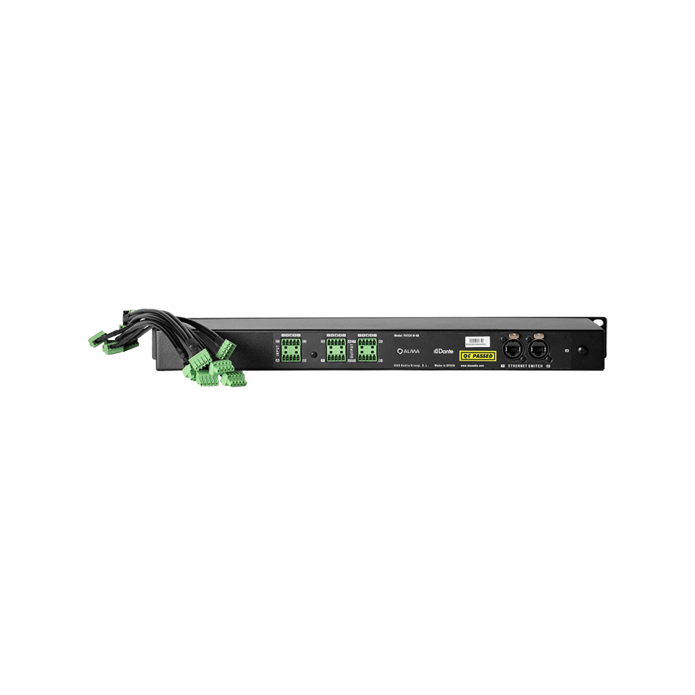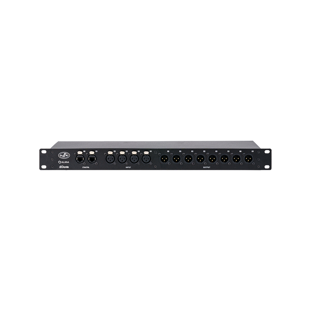 Patchpanel, 8 IN x 8 OUT (analóg audio), 2x EtherCon ALMA és DANTE csatlakozáshoz, 1U 19″-es rackbe szerelhető panel, Neutrik szimmetrikus csatlakozók.