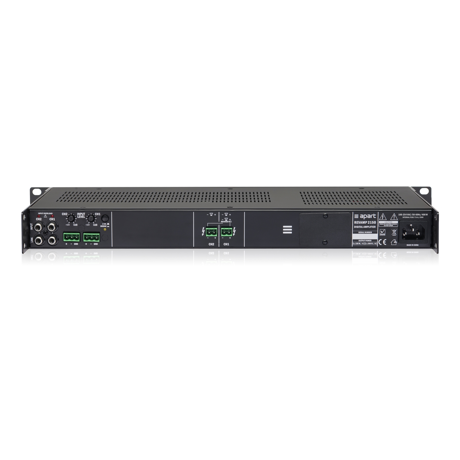 2-csatornás D-osztályú erősítő, 2 x 150 W (RMS 4 ohm-nál), 2 x 165 W (dinamikus 4 ohm-nál) vagy hidalt üzemmódban 1 x 300 W (RMS 8 ohm-nál), hűtőbordás hűtés, 1U, 19″-os rack-be szerelhető.