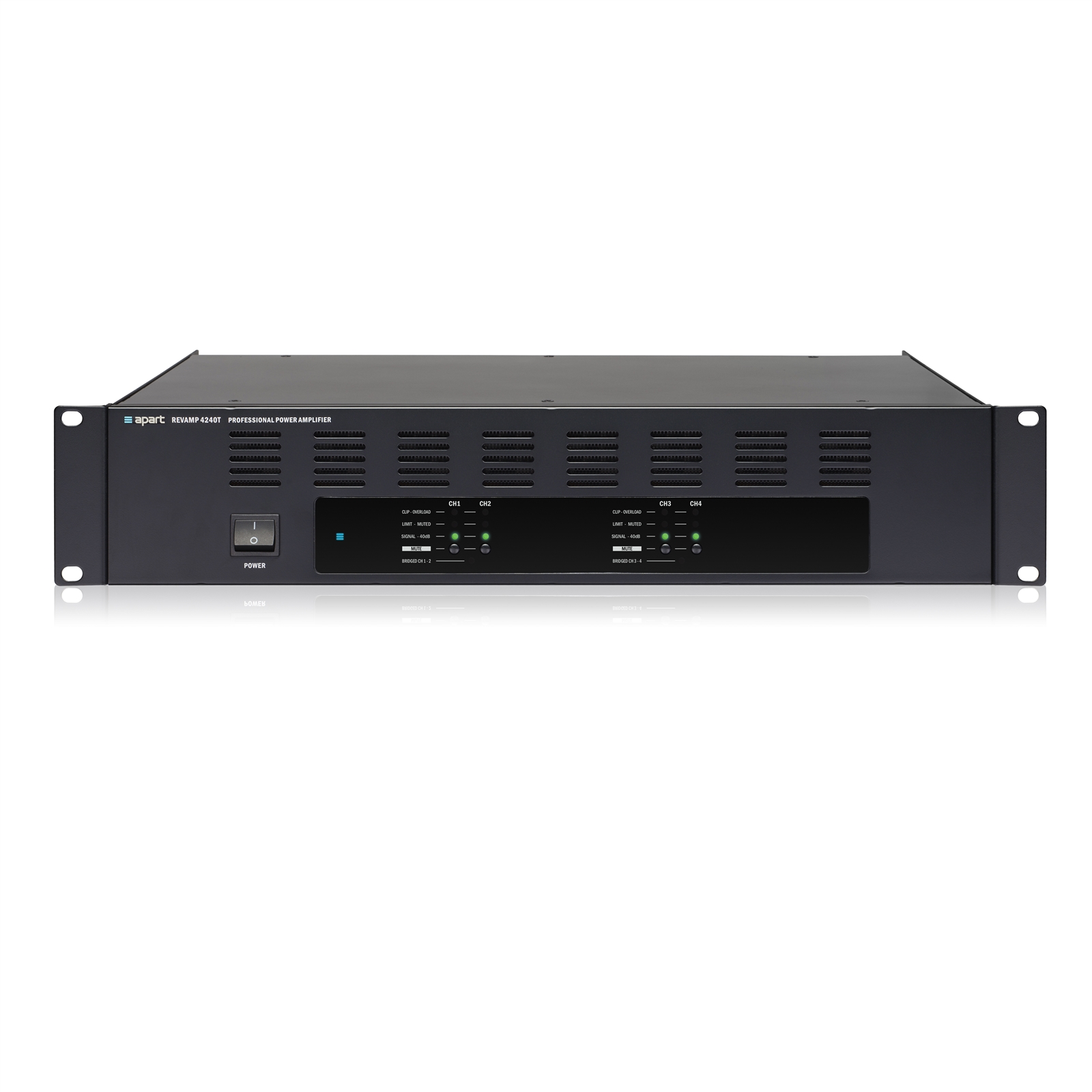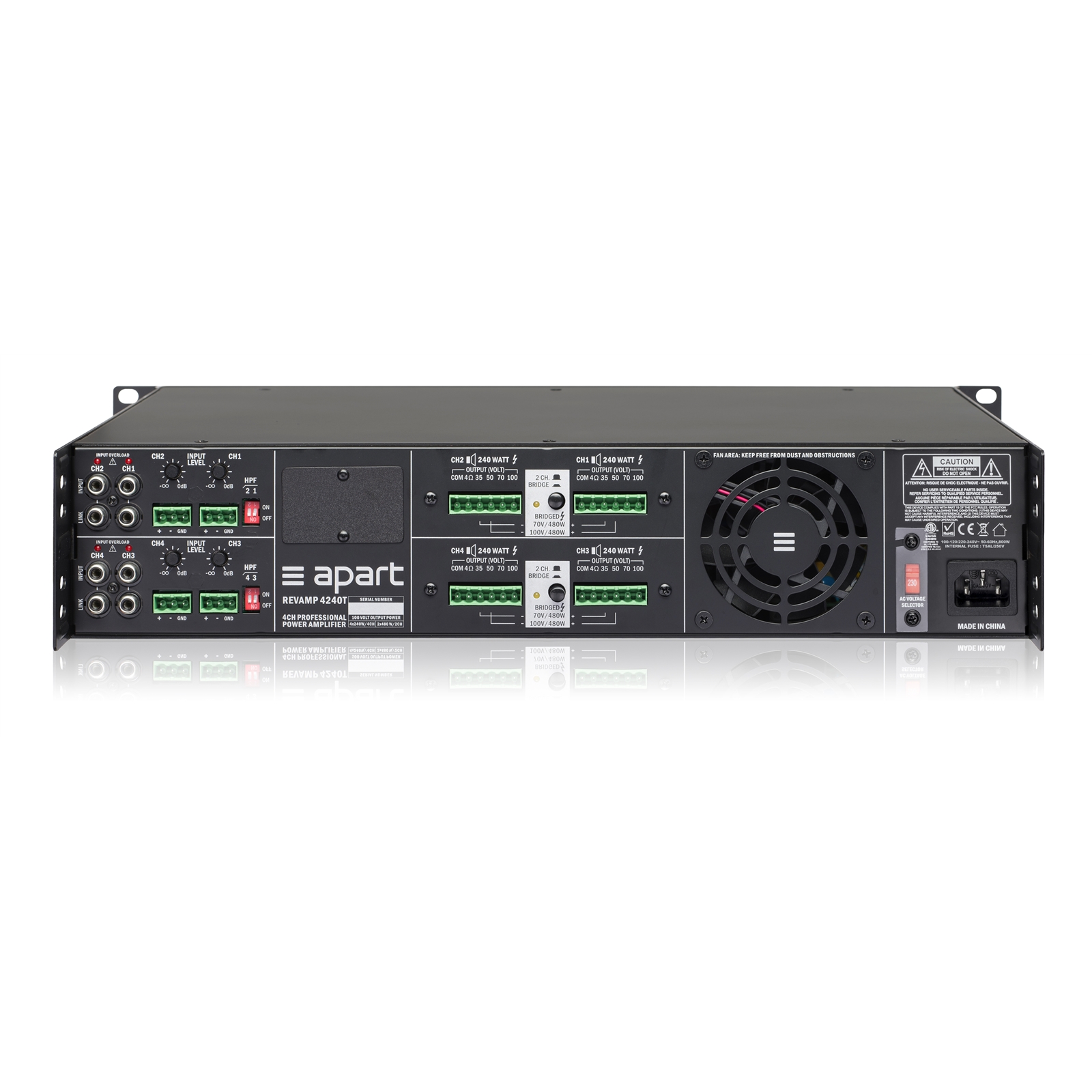REVAMP4240T is a professional 4-channel digital power amplifier with 4 x 240 watt output power @ 100 volt, but the unit is also bridgeable to 2 x 480 watts @ 100 volt. The unit incorporates a high efficient SMPS power supply and outputs with efficient Class D output topology.