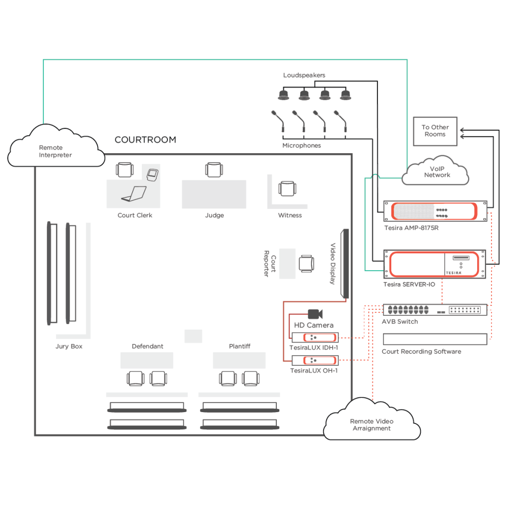 A Tesira SERVER-IO segítségével megbízhatóan kezelhetők a bírósági tárgyalótermek hangrendszerei: pl. hangszórók és mikrofonok hangerejének/jelszintjének beállítása, felvételkészítés, távoli bírósági eljárások lefolytatása, hangforrások (DVD, MP3 stb.) lejátszása, valamint felvevők és egyéb eszközök kezelése. A Tesira SERVER-IO több bírósági tárgyalóterem kezeléséhez is elegendő DSP teljesítménnyel rendelkezik, a Tesira integrált platformján keresztül pedig az eszközök megoszthatják a jelfeldolgozáshoz, VoIP használathoz és hangosításhoz szükséges erőforrásokat. A TesiraLUX a távoli bírósági eljárások videorendszereként is működhet, hatékonyabbá téve a bíróságok működését és csökkentve a felmerülő költségeket. A bírósági felvételkészítő szoftvert futtató számítógépbe telepített AVB/TSN kártya a bírósági eljárások hanganyagát zökkenőmentesen tudja rögzíti.