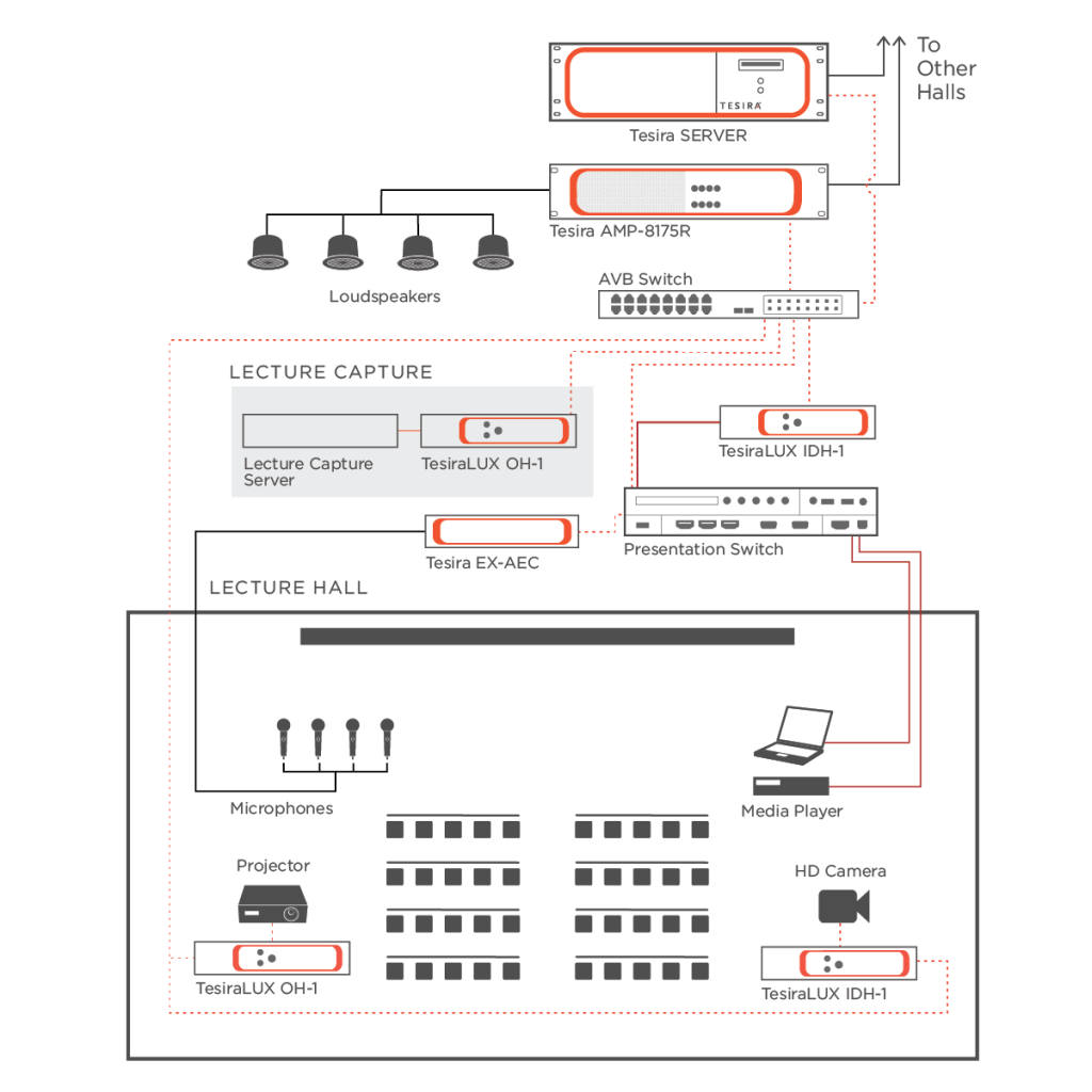 A Tesira SERVER segítségével a DSP jelfeldolgozás és a hardvereszközök több helyiség számára is elérhetők, ami lehetővé teszi, hogy egy professzor egyidejűleg akár több osztályteremben is foglalkozást tartson. A Tesira SERVER a létesítmény egészét, valamint az egyes oktatók egyedi igényeit is rugalmasan képes kiszolgálni. Mivel a TesiraLUX előadásrögzítő eszközökhöz is kapcsolódik, a professzorok kiváló minőségű hang- és videoanyagokat rögzíthetnek a tanórákról későbbi felhasználásra. A különféle fejlett szoftverfunkciók (úm. automatikus keverés és dinamikus jelfeldolgozás) szükségtelenné teszik a hangerő szintjének kézi beállítását. A Tesira erősítőkkel rugalmasabban oldható meg a hangosítás és a hangelosztás, mivel ezek az audiohálózat bármely pontjáról képesek jelet fogadni.