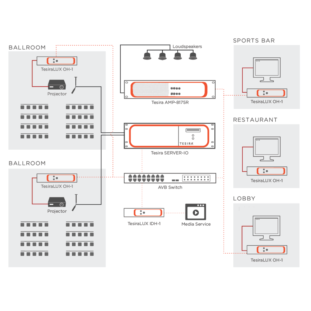 A Tesira segítségével a hotel vagy a konferenciaközpont egészében könnyedén megoldható a hang- és videoanyagok kezelése és elosztása. A környezeti zajkompenzáció integrálásával lehetővé válik, hogy a hangerő automatikusan alkalmazkodjon az adott tér hangerejéhez. A TesiraLUX használatával a munkatársak az épület bármely pontjára kiváló minőségben közvetíthetik a hang- és videoanyagokat, mégpedig kivételes ajakszinkron biztosítása mellett. Hotelek esetében a Tesira a báltermek, az étkezőhelyek, a lobby, valamint a kistárgyalók hangrendszereit is képes kezelni. A Tesira ráadásul egyéb protokollokat (pl. CobraNet és Dante) is támogat és zökkenőmentesen kezel.